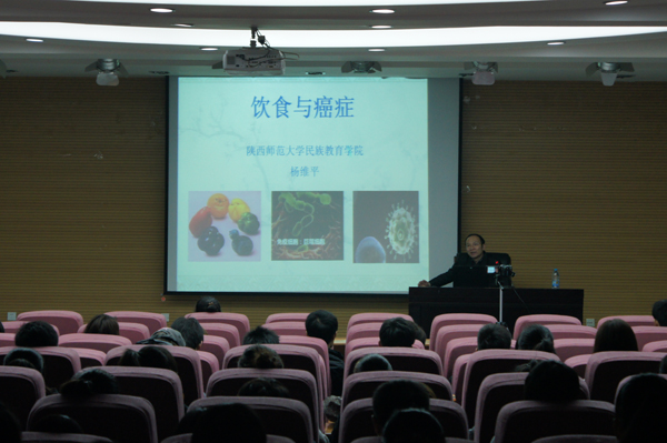 3月28日14点30分,关于“饮食与癌症”的讲座在崇鋈楼三楼归仁堂举行,本场讲座由我院副院长杨维平教授主讲。我院近两百学生聆听了这次讲座。讲座由院办公室主任窦文阳老师主持。