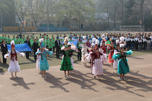 在开幕式表演中,由预科同学带来的啦啦操表演活力四射、热情洋溢,整齐划一的节拍、阳光青春的笑容,赢得了全场师生的阵阵喝彩。接下来由预科各班级学生精心准备的哈萨克族、维吾尔族、苗族和藏族舞蹈表演,将开幕式推向了高潮,曼妙的民族音乐配着轻快的步调,为本次运动会增添了一抹亮丽的民族和谐色彩。