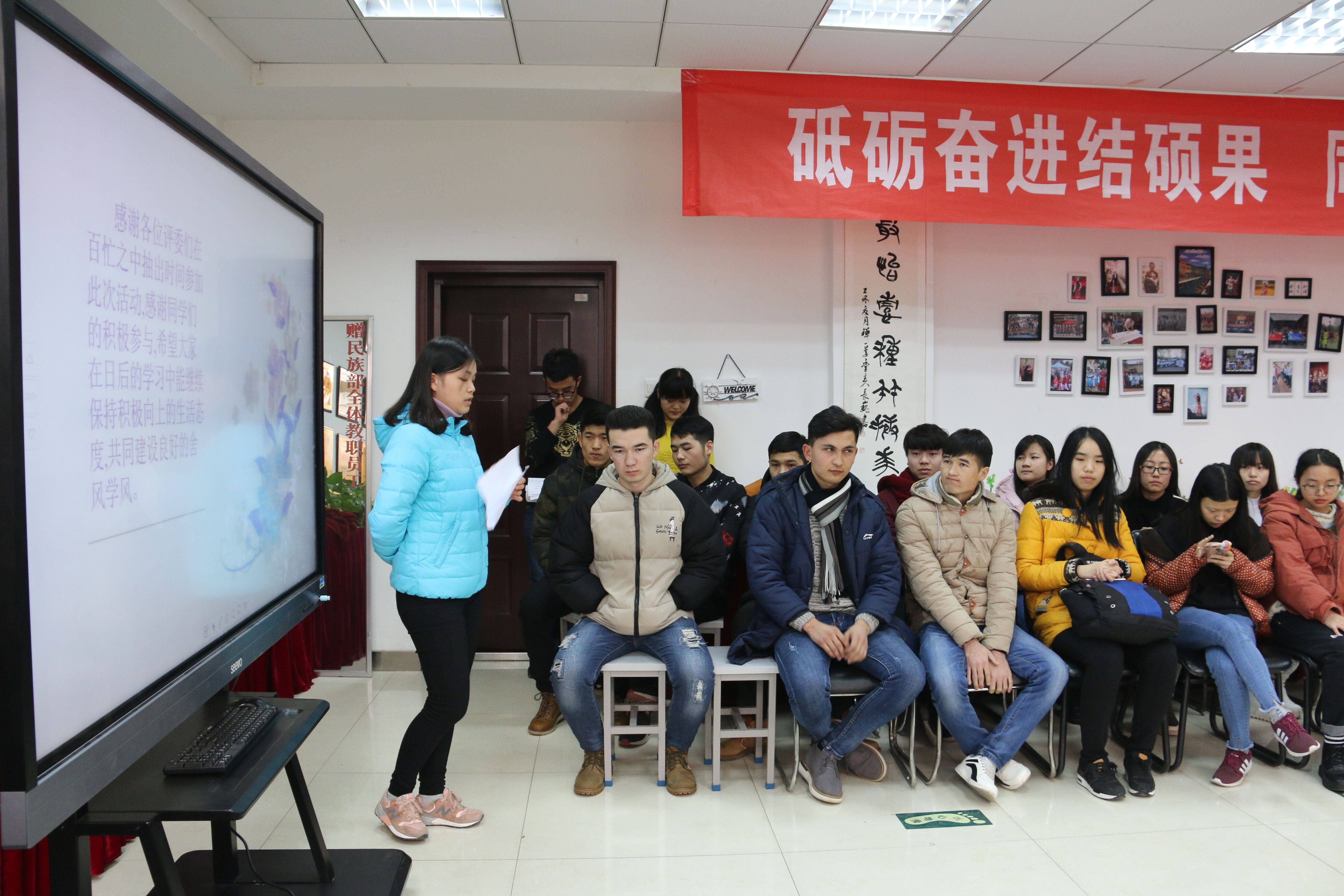 颁奖环节后,学生会主席发言,他说,宿舍就是我们的第二个家,同时对同学们为营造温馨宿舍环境的热情给予赞扬。最后,我院辅导员热依木老师总结讲话,他向组织本次寝室文化节的学生会成员及参加这次文化节的闭幕式的老师和同学们表示由衷地感谢。还表示从这次文化节活动中,他看到了每个人的付出,也看到了同学们展示的各民族的文化以及特色食品,并希望同学生们在今后的学习和校园生活中,要本着“创新、协调、绿色、开放、共享”的发展理念,学习和践行社会主义核心价值观,不断体验和传承中华文化,陶冶情操,塑造灵魂,再接再厉,继续发扬民教院的风采,健康成长成才。