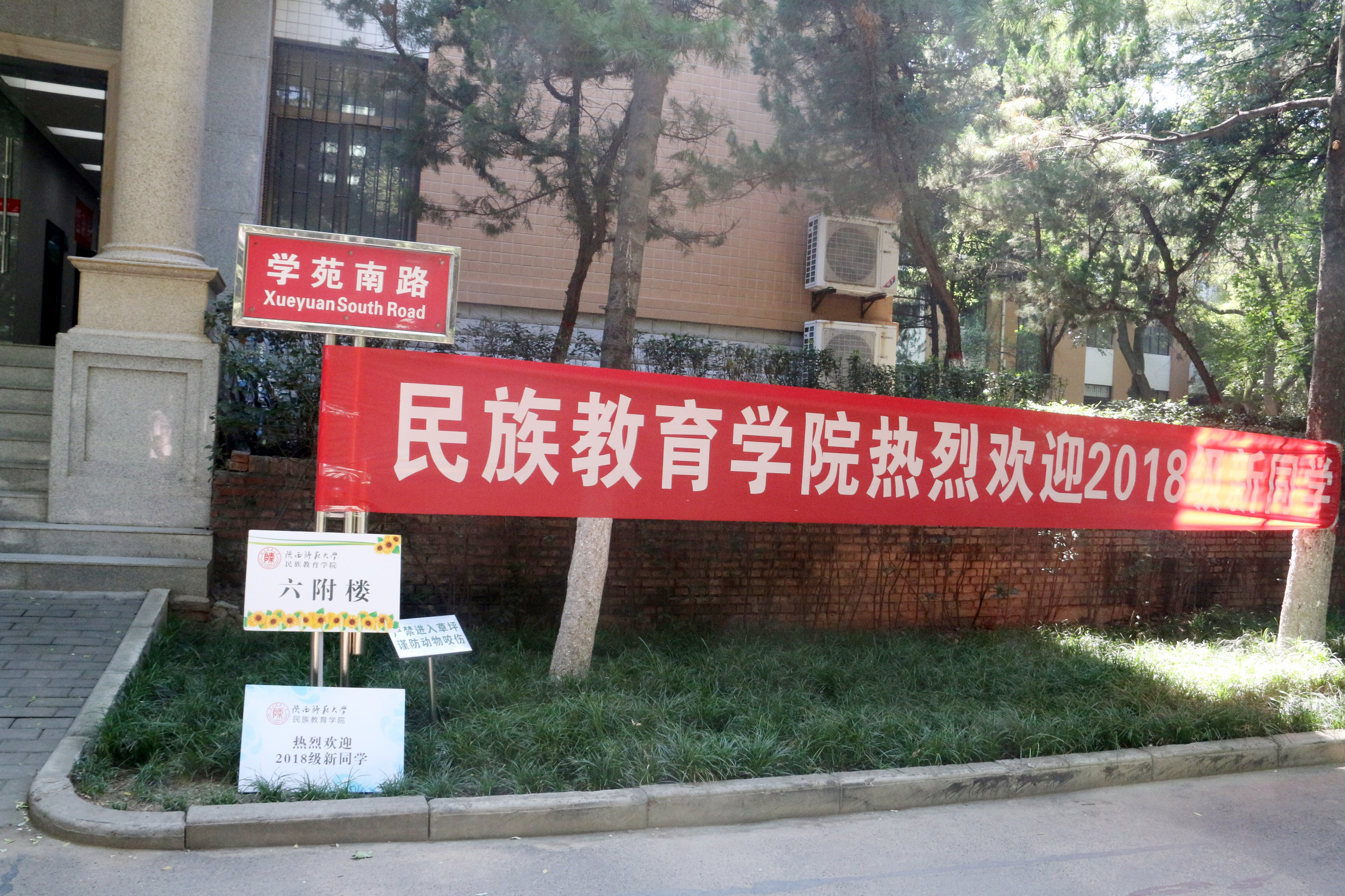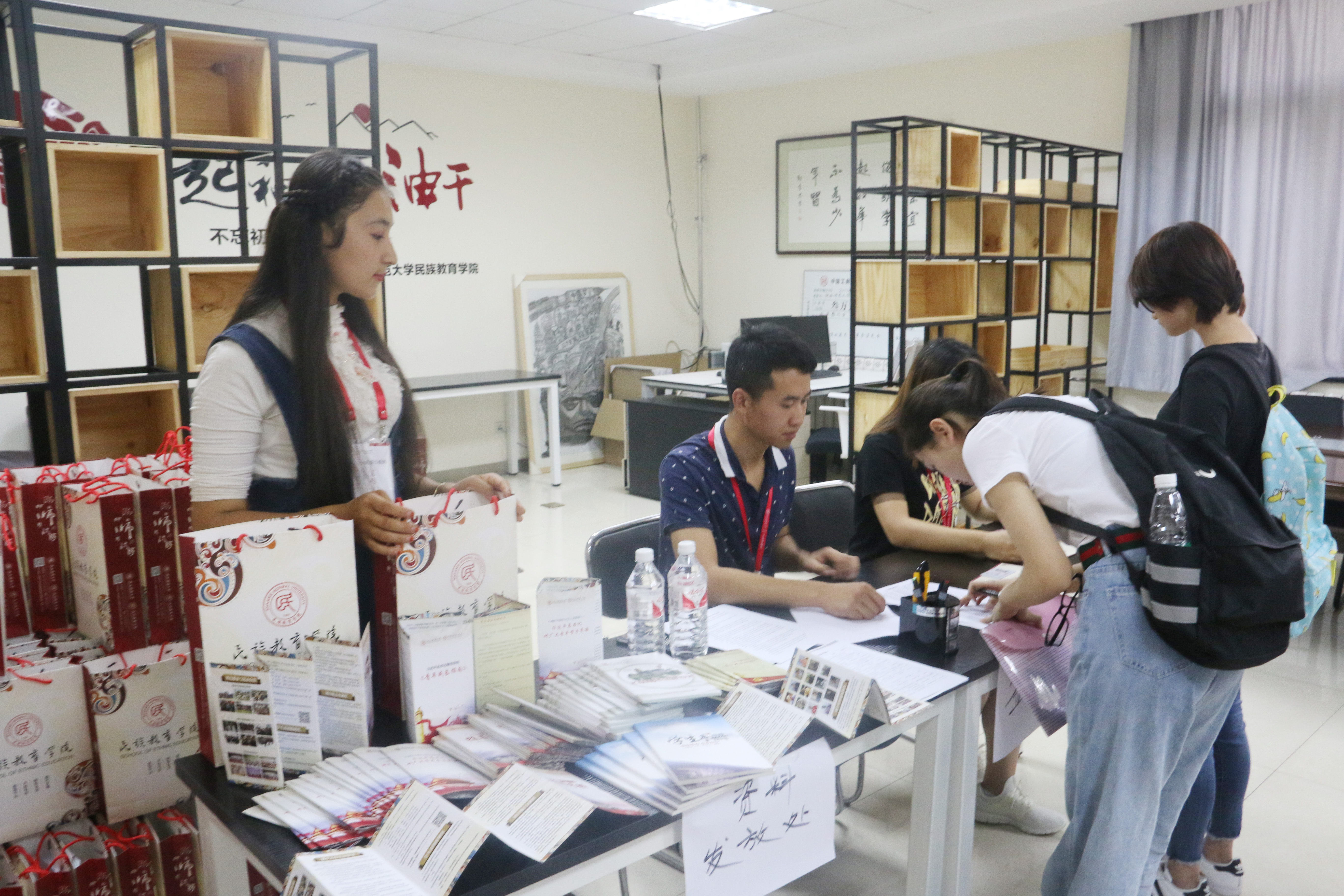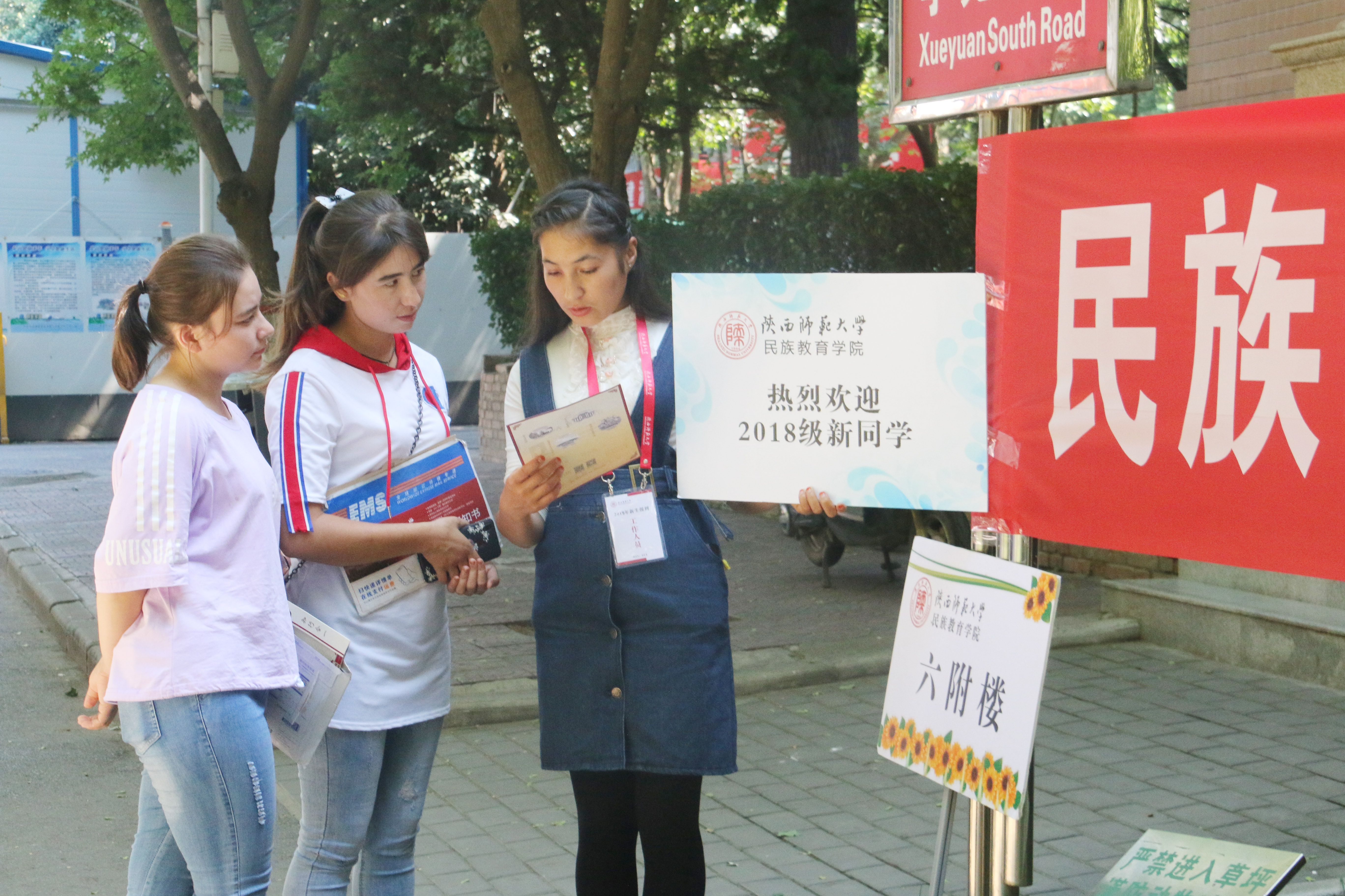 为了做好本次迎新工作,我院在几天前就开始着手布置场地,早早为新生们拉起的欢迎条幅、报道厅中展示的各民族工艺品还有校园多处设置了咨询处等……这些不仅体现了民教院浓浓的民族风情,也显示了民教院团结友爱,互帮互助的大家庭氛围。