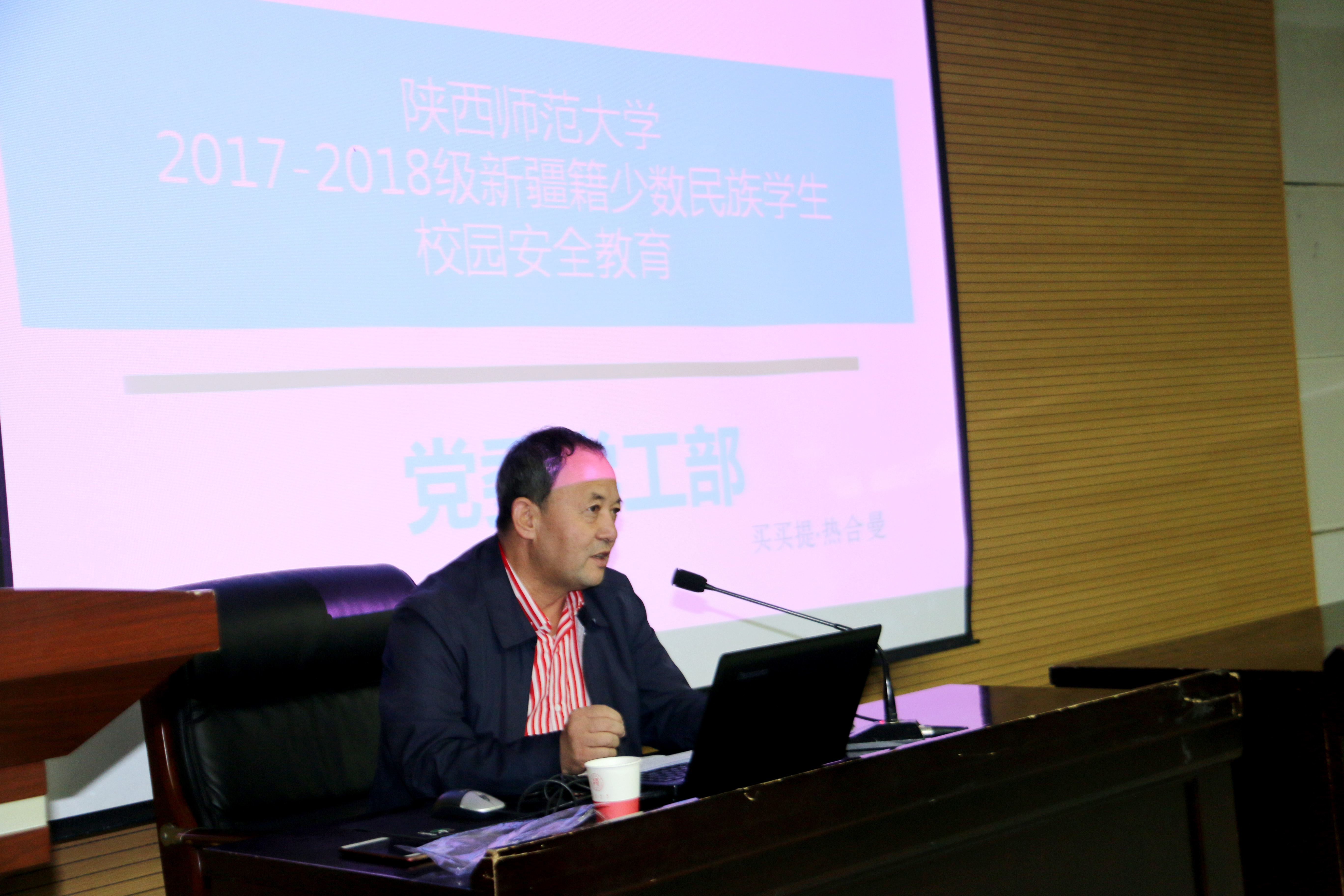 10月17日下午2:30,我校新疆内派管理服务教师买买提·热合曼为我院新疆籍少数民族学生进行了以《2017、2018级新疆籍少数民族学生校园安全教育》为题的校园安全主题讲座。讲座旨在进一步加强对少数民族预科生的思想安全教育,强化学生安全防范意识,增强法制观念,维护健康的心理状态,帮助少数民族预科生积极适应大学生活,同时协助我校做好少数民族大学生安全教育工作。新疆维吾尔自治区驻陕西工作组苏来曼·牙合甫,我院专职辅导员热依木、2017、2018级新疆籍预科学生参加了此次讲座,讲座由辅导员热依木主持。