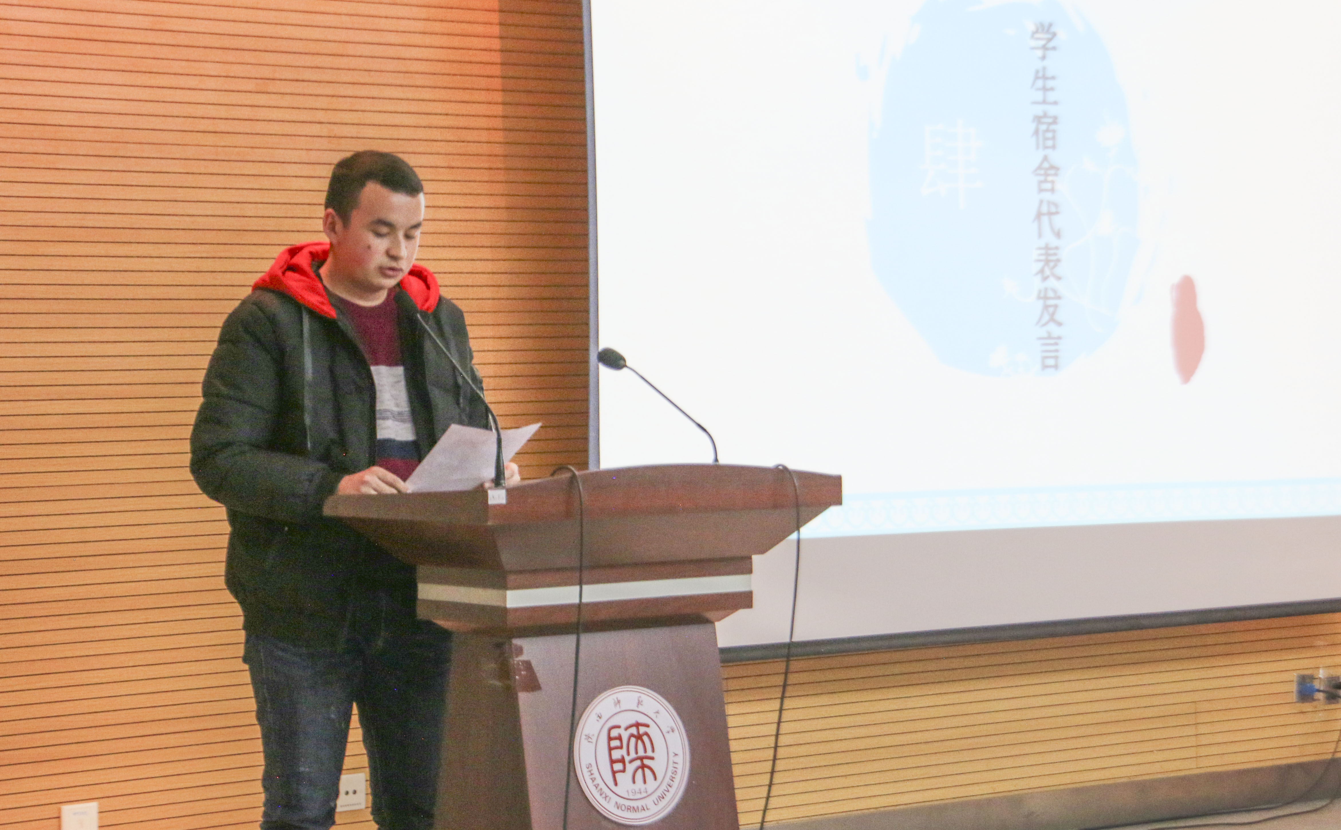 大会最后,郑生忠老师为我们的活动进行总结,为宿舍文化节圆满成功表示祝贺,老师为我们介绍他在陕师大的亲身经历,分享的故事启示我们要珍惜在大学宿舍的点点滴滴,要像爱家人一样去爱自己的舍友,无论为这个集体付出多少都是值得的。从宿舍生活的点滴可以看出老师乐观的生活态度和对舍友浓浓的情谊让我们受益匪浅。最后他提出三点要求,第一学会交往和包容;第二养成正确的学习态度和良好的学习习惯第三,整体发展,互相促进学习。他强调,文明、和谐的宿舍环境对大学生的成长至关重要,他希望每位同学增强宿舍文化建设意识,共同营造整洁、舒适、和谐的生活环境和文化氛围,将“学生宿舍文化建设月”活动打造成为我院传播先进文化的阵地与发现优秀人才的摇篮,推动我校校园文化建设和学生管理工作再上新台阶。