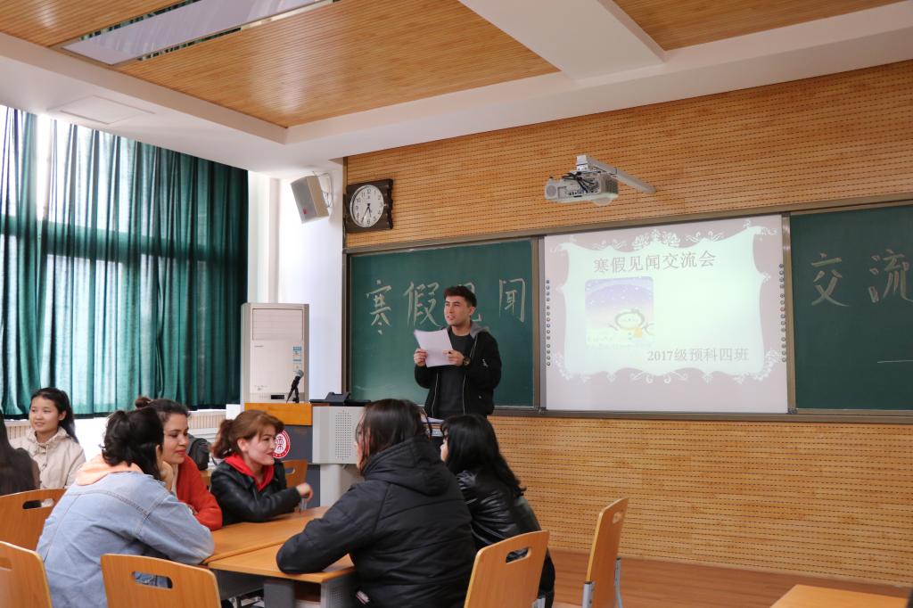 交流会上,2018级预科三班阿迪力江·阿布杜海外尔同学分享了自己在寒假期间做家教的经历,分别从自身的服务心态、课程知识、与家长和学生的沟通方式以及自身定位等方面向大家介绍了家教过程中点点滴滴,使同学们明白了即使是做兼职也要竭尽全力、有计划、一丝不苟地完成自己的工作。之后还联系到了自己的学习生活,展示了自己在寒假中所阅读的名著和所作的读书笔记,从书中获得了很多的文学智慧和人生道理,这是一个大学预科生慎独的典型,坚持学习,毫不松懈。2018级预科2班的黄金凤同学分享了自己寒假期间到杭州、浙江、桂林等地游玩,目睹了祖国的秀丽山川、宏伟建筑以及交通出行之便捷程度,增长了知识,开阔了自己的眼界,表示自己要努力学习所兴趣的专业知识,将来做一位对社会有用的人,为祖国建设增砖添瓦。2018级预科1班的韩希玥同学分享了自己在在寒假中观看的电影《流浪地球》的精彩情节,跟同学们互动讨论,最后总结到地球只有一个,是我们共同的家园,我们每个人都有职责去保卫她、珍惜她和爱护她,要从身边的小事做起,节约用水,节约纸张,少用一次性塑料产品,少用一度电等等,只有每个人都动起来形成合力,我们才不会被地球抛弃,被迫移居到其他未知的星球。每每发言者的话音刚落就引来同学们的阵阵掌声......