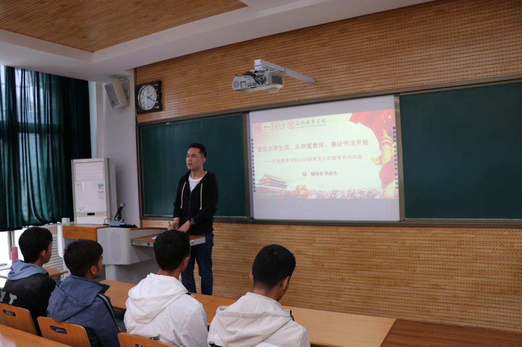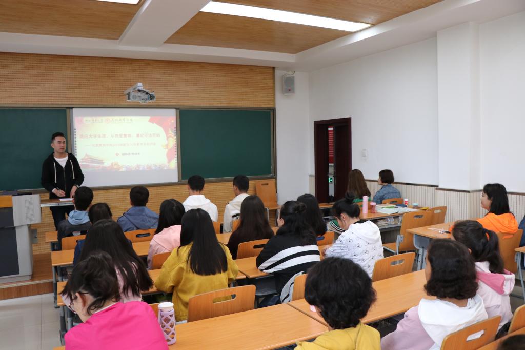 我院专职辅导员热依木老师,以“适应大学生活,从热爱集体、遵纪守法开始”为题,结合我院历年发生的典型学生教育管理案例,使得同学们了解大学教育教学特点尽快适应大学生活与环境,向同学们详细讲解了学校和学院的各项规章制度,并提醒学生要提高警惕、注意安全,严于律己,将学校与学院的规章制度铭记于心。
