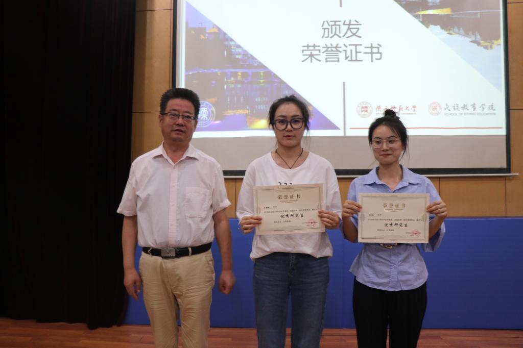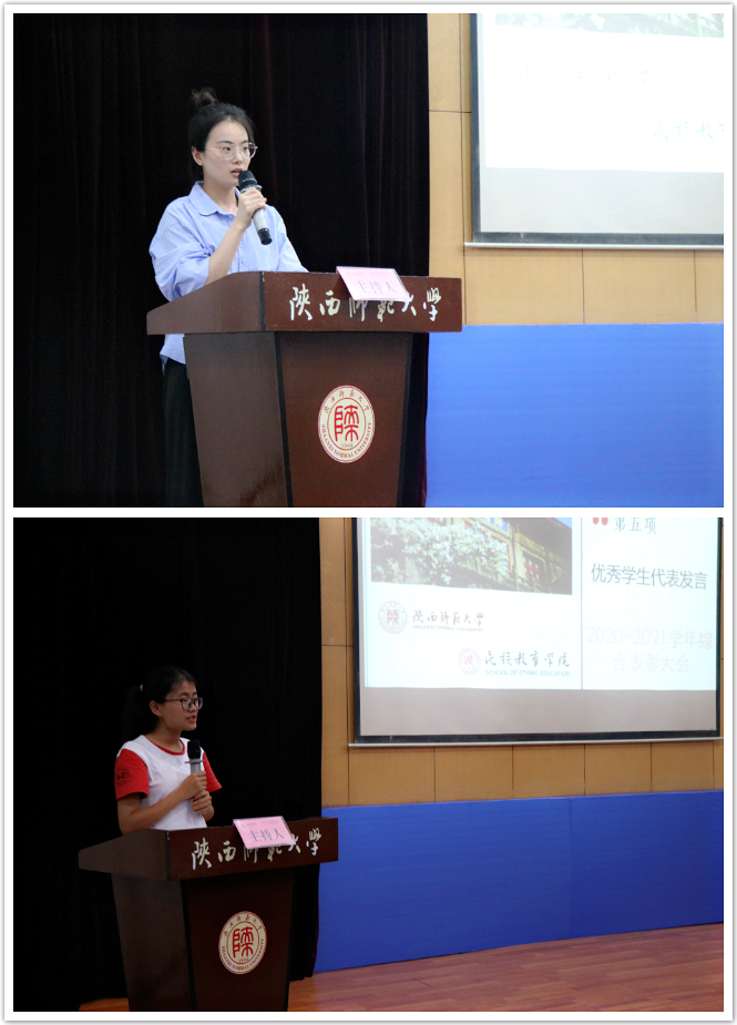 随后,优秀研究生王奕迪、优秀预科生黑良杏代表全体获奖学生依次发言。她们分别汇报了自己在学习、生活、实践中所取得的成果,分享了自身的经历和感受,并表示会带着一生的民教情,传承和弘扬“西部红烛精神”,常怀感恩之心,不断努力,奋勇向前。