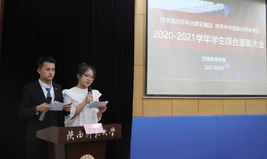 2020-2021学年度优秀学生综合表彰大会在雁塔校区学术活动中心二层报告厅举行。学院党总支书记郑生忠,党总支副书记高冬,新疆内派管理服务教师孙国强,教学秘书贾文红,教师代表戴妍、乔露,全体辅导员,以及全体学生参加了大会,大会由预科2班马博亚和预科1班苏雯雨主持。