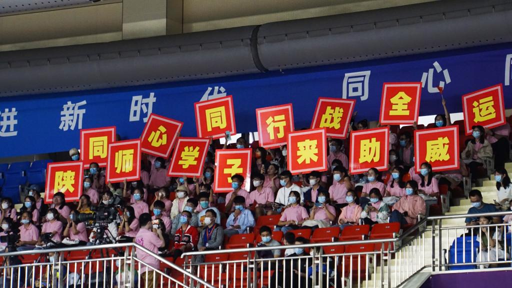 比赛现场,同学们聚精会神、凝神屏气,发球、传球、扣杀……每拿一分,同学们就立即高举宣传板,高呼“同心同行战全运,陕师学子来助威”的口号,整齐高亢、此起彼伏、响成一片。同学们都被瞬息万变的赛况牵动着,为了同一瞬间欢呼、遗憾。