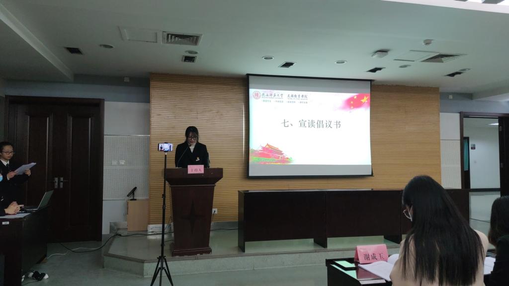 第十五次学生代表大会暨研究生代表大会的6名代表。大会筹委会委员何诺冉向全体学生倡议:作为新时代大学生,我们一定要爱国荣校,坚定理想信念;明德立身,锤炼高尚品德;勤思善悟,丰厚学识涵养;求实创新,增添实践才干,努力提高自身素养,争做社会主义现代化的建设者和接班人,在实现中国梦的伟大实践中放飞青春梦想。