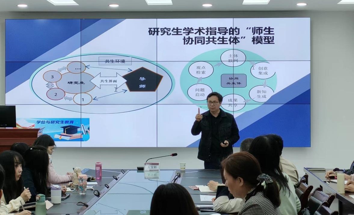 在专题报告交流环节,龙宝新教授为西藏民族大学教育学院师生做了“新文科背景下教育学专业研究生培养模式创新的思考”专题报告。报告从“旧文科”现今面临的痛点出发,结合教育学人才培养工作现实需要,提出要在“新文科”这一背景下进行人才培养模式改革工作。龙宝新教授结合自身对研究生教学与培养经验,对“悟Class”课堂创建、“师生协同共生体”模型、“MSC”陈述结构、四大学术创新原理、研究生百字小结以及研究生论文指导全过程思维导图进行了分享。龙宝新教授领衔的研究生导学团队秉持“学术为本、幸福为要”的价值指针,奉行“实践出真能”学术训练思维,倡导关爱、体谅、拼搏的团队文化,致力于增强团队凝聚力、学术力与教育力的培育观念对研究生学术培养发展、水平提升产生了一定影响。龙宝新教授的倾囊讲授,获得了该院师生的赞赏与肯定。