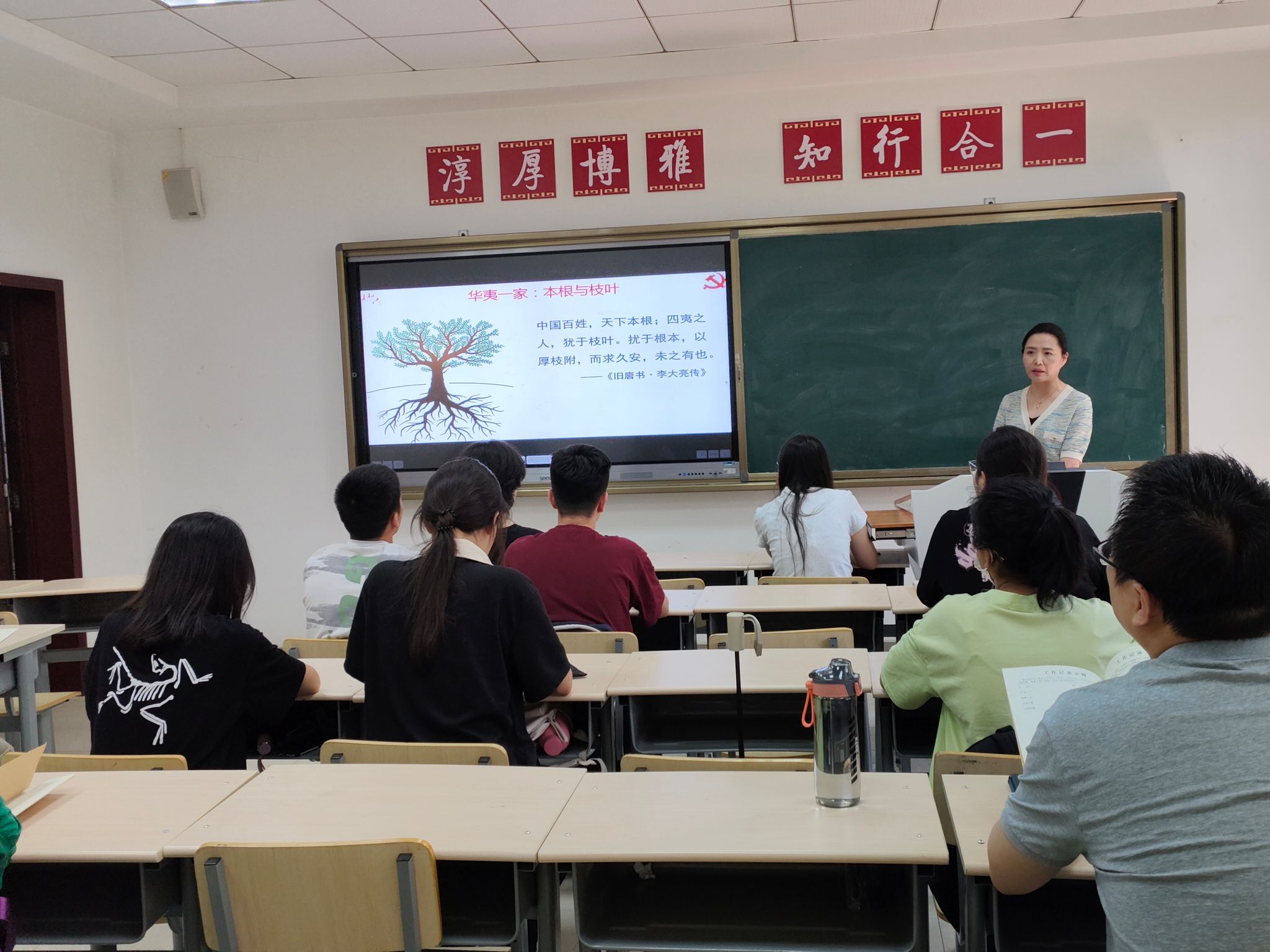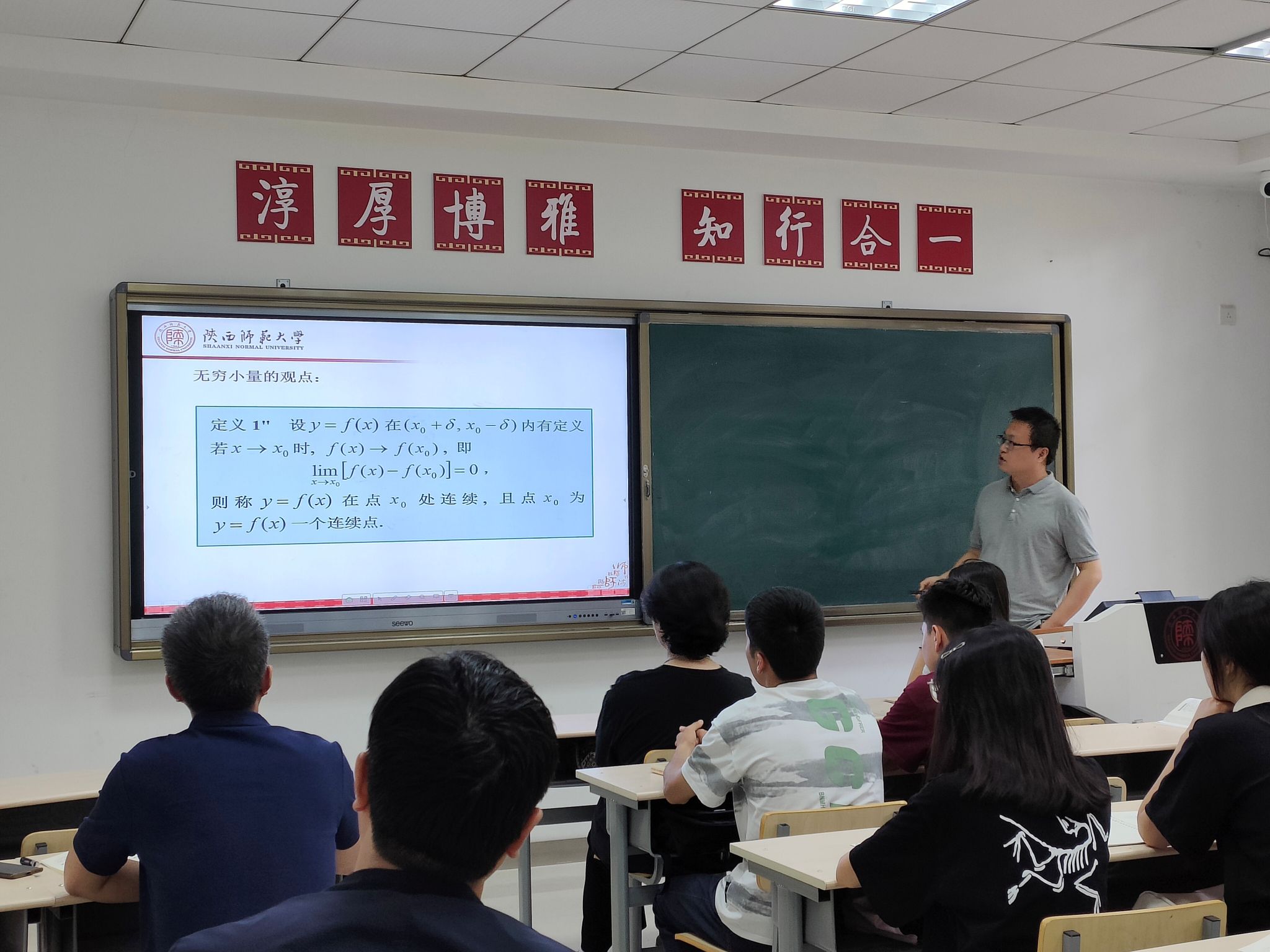 此次教学示范课由萨仁娜老师和乔露老师执教。萨仁娜老师的授课内容为《华夷一家:本根与枝叶》,萨老师以《旧唐书》中的句典导入课程,引出主题“本根与枝叶”,强调习近平总书记在中央民族工作会议中提出的关于民族政策的“四对关系”,重点分析讲解其中“共同性和差异性”关系。在授课过程中,萨老师表述清晰,引用史例丰富,注重和学生的交流互动,取得了良好的课堂效果。随后,乔露老师围绕《函数的连续性》进行授课,乔老师以经典故事“断桥残雪,邂逅浪漫”引出数学“连续”的概念,引导学生探索发现生活中的数学现象,从而激发学生学习数学的兴趣,通过例题的讲解,详细展示如何判断函数的连续性。乔老师授课逻辑性强,注重课堂讲授与启发思考相结合,获得在场师生的好评。