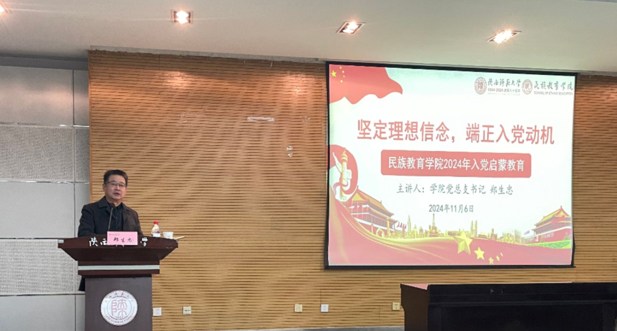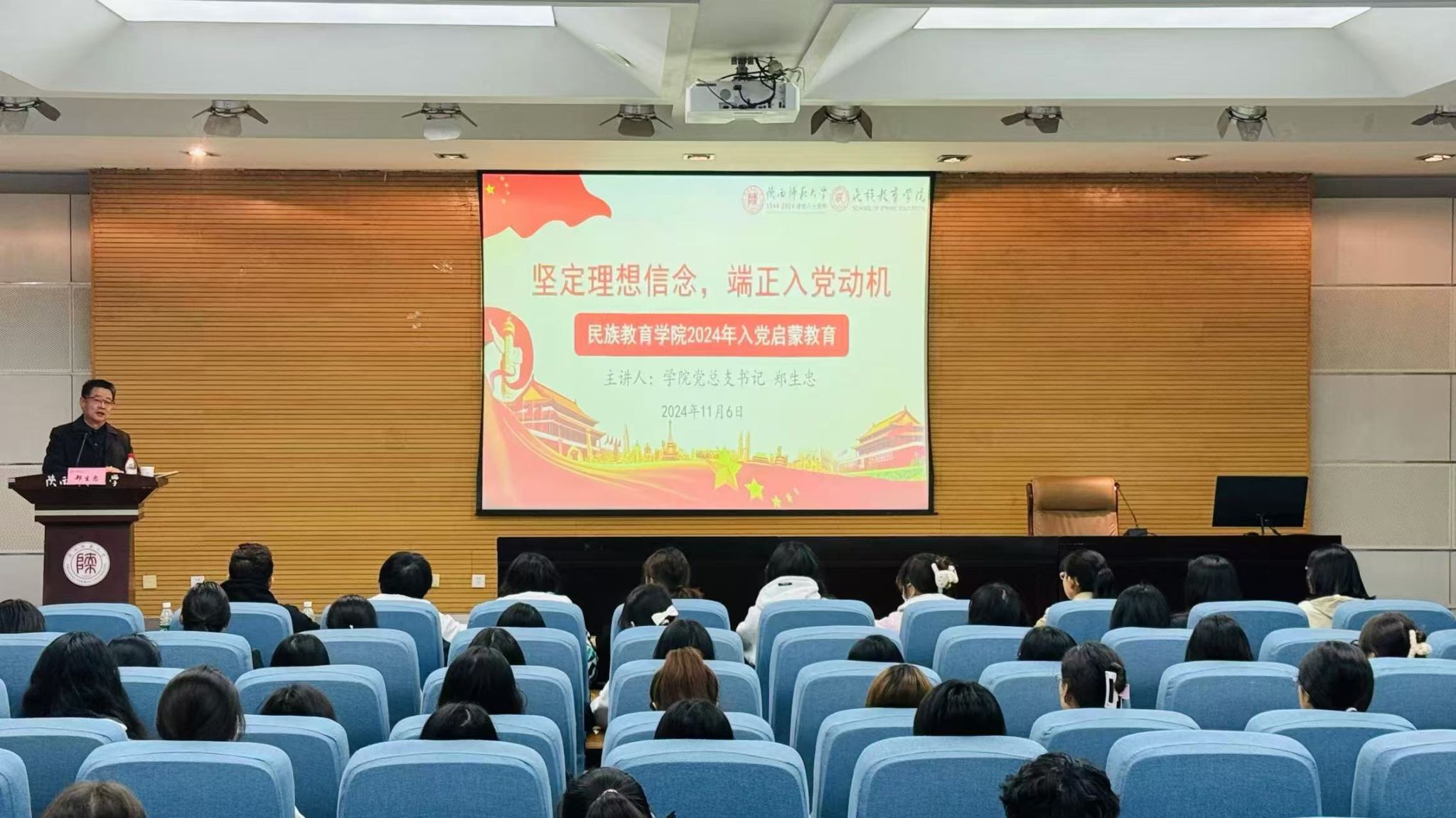 在崇鋈楼一层学思堂举办“2024年入党启蒙教育专题讲座”。此次讲座由学院党总支书记郑生忠主讲,全院同学参加此次讲座。讲座由团委书记热依木・努尔麦麦提主持。