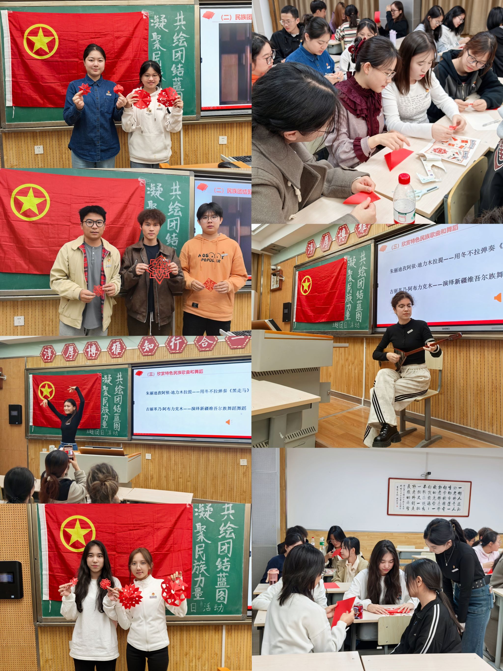 “共筑民族心”特色活动环节将现场气氛推向高潮。同学们分组进行了剪纸活动,剪刀在纸张上飞舞,每一刀都蕴含着对“民族团结一家亲”的深情诠释。与此同时,两位同学登台演绎民族歌曲和舞蹈,其独特的民族文化魅力赢得了现场师生的阵阵掌声。