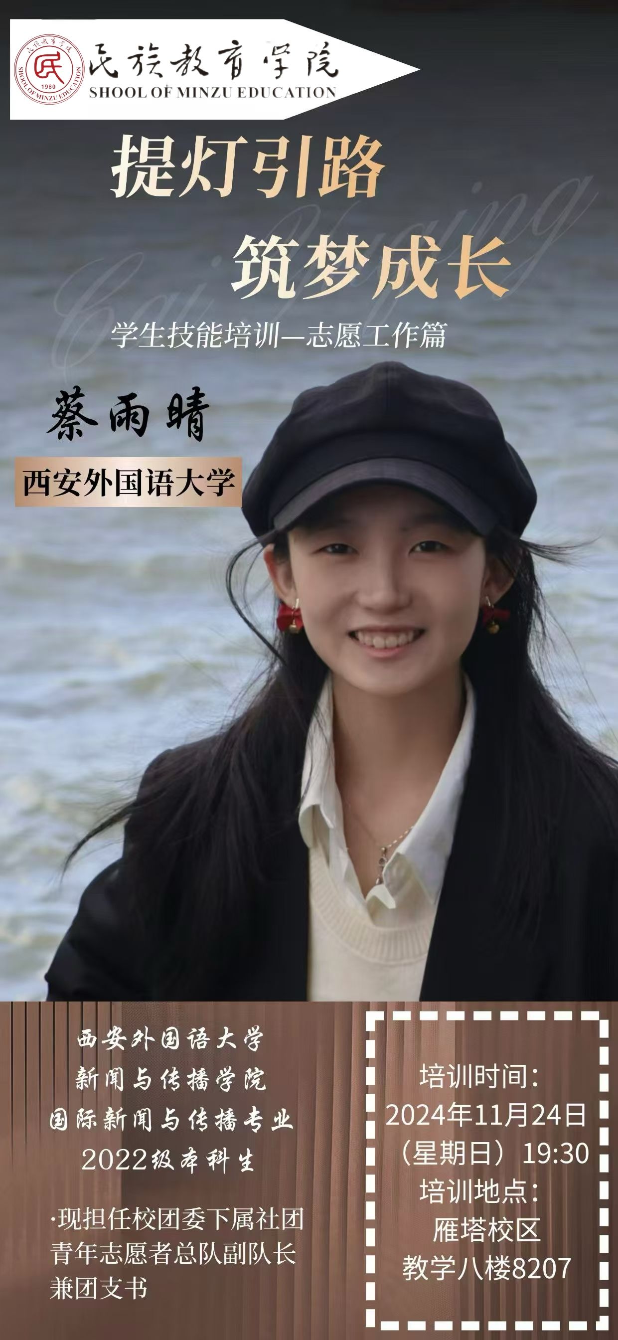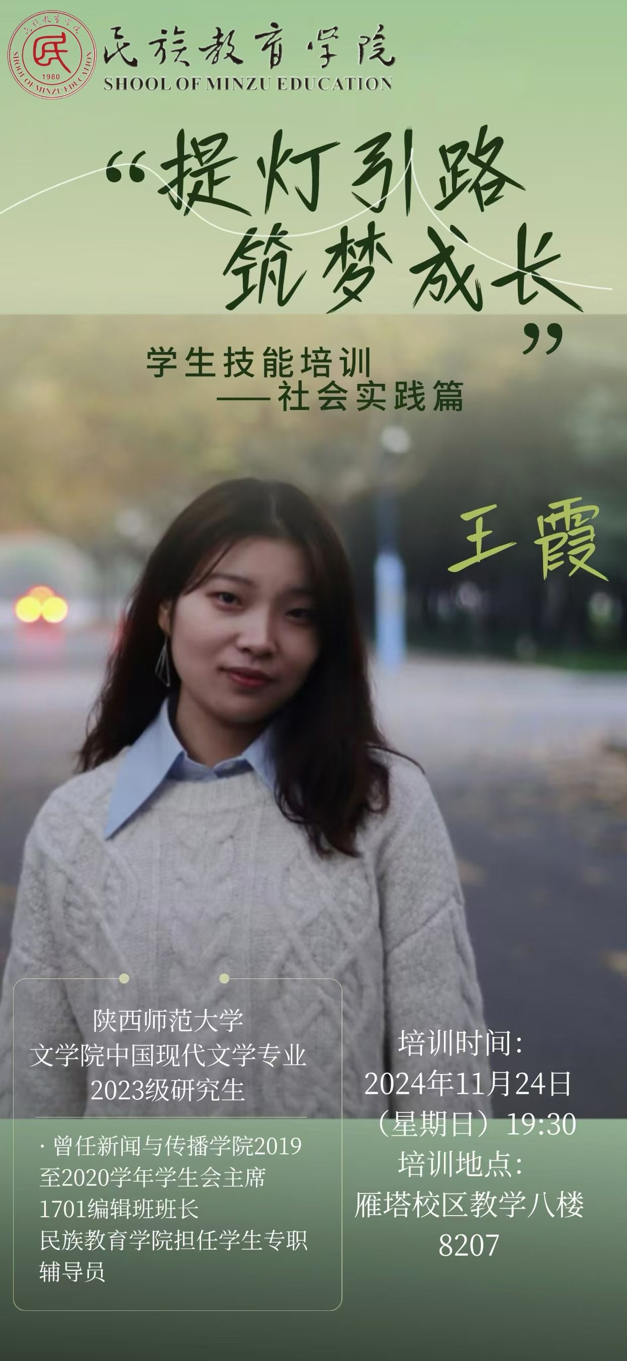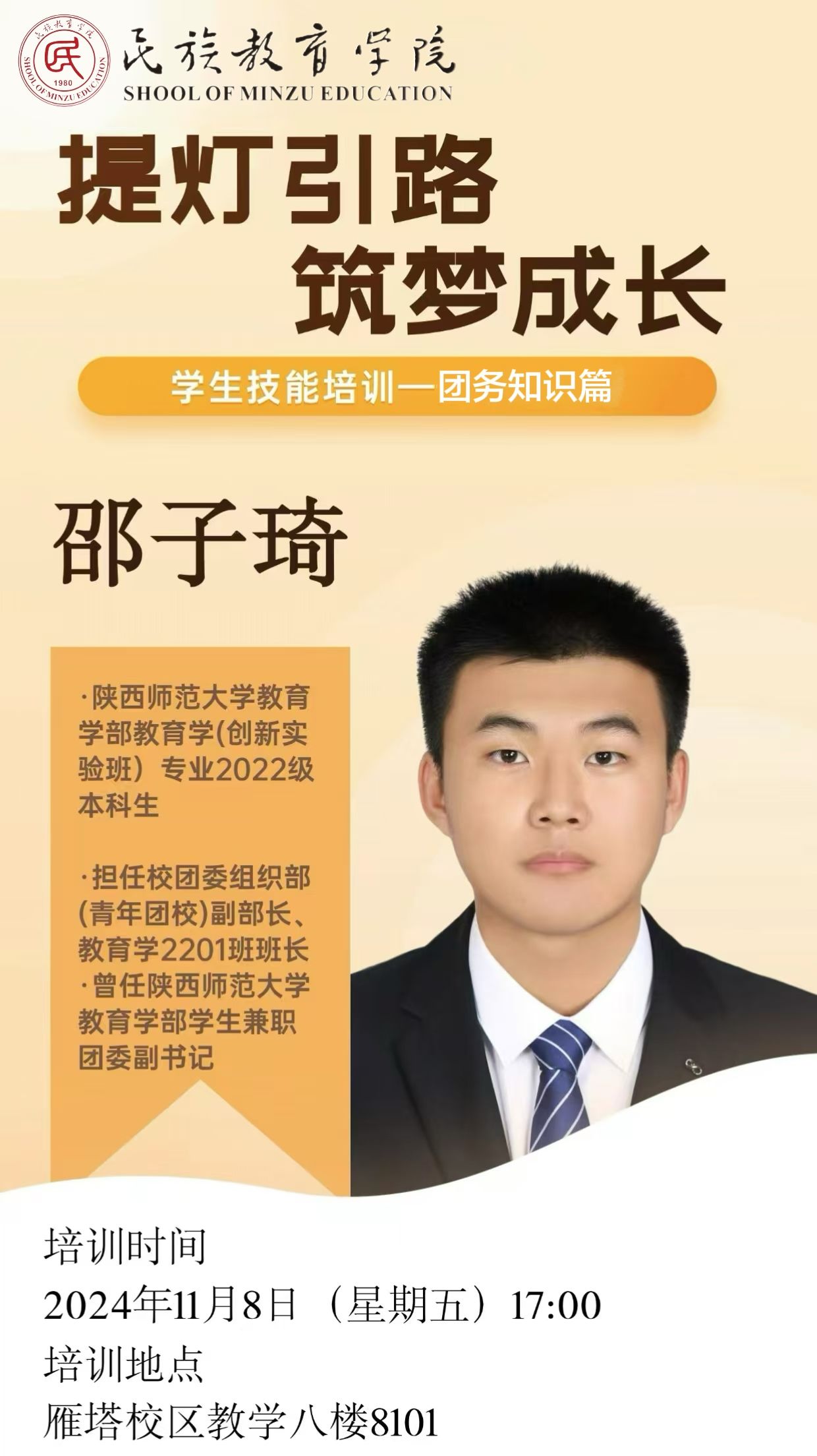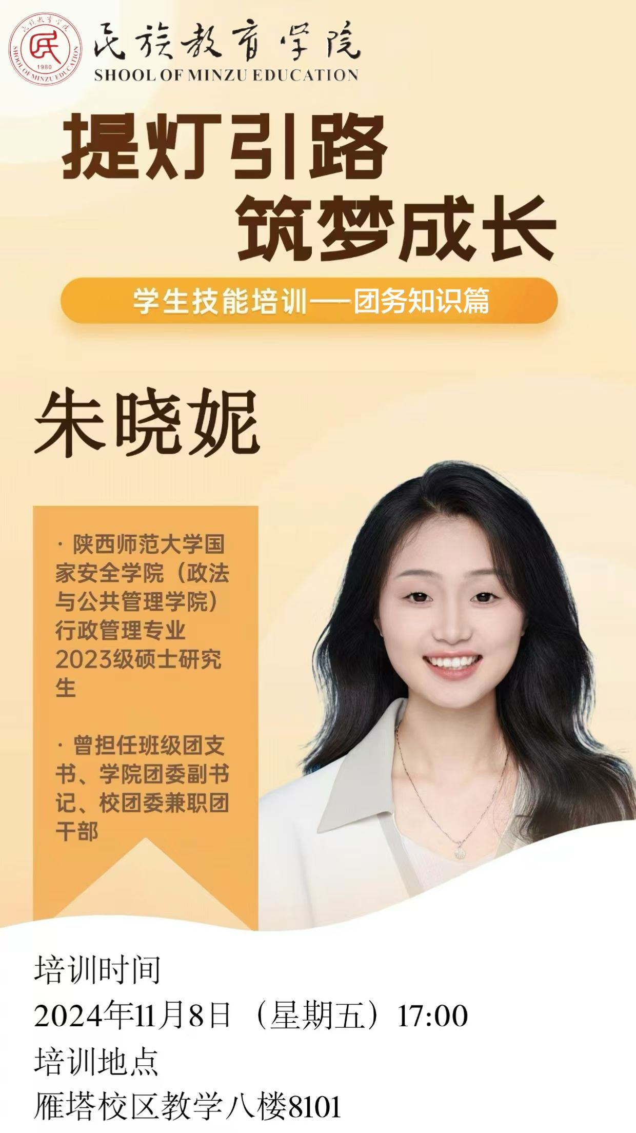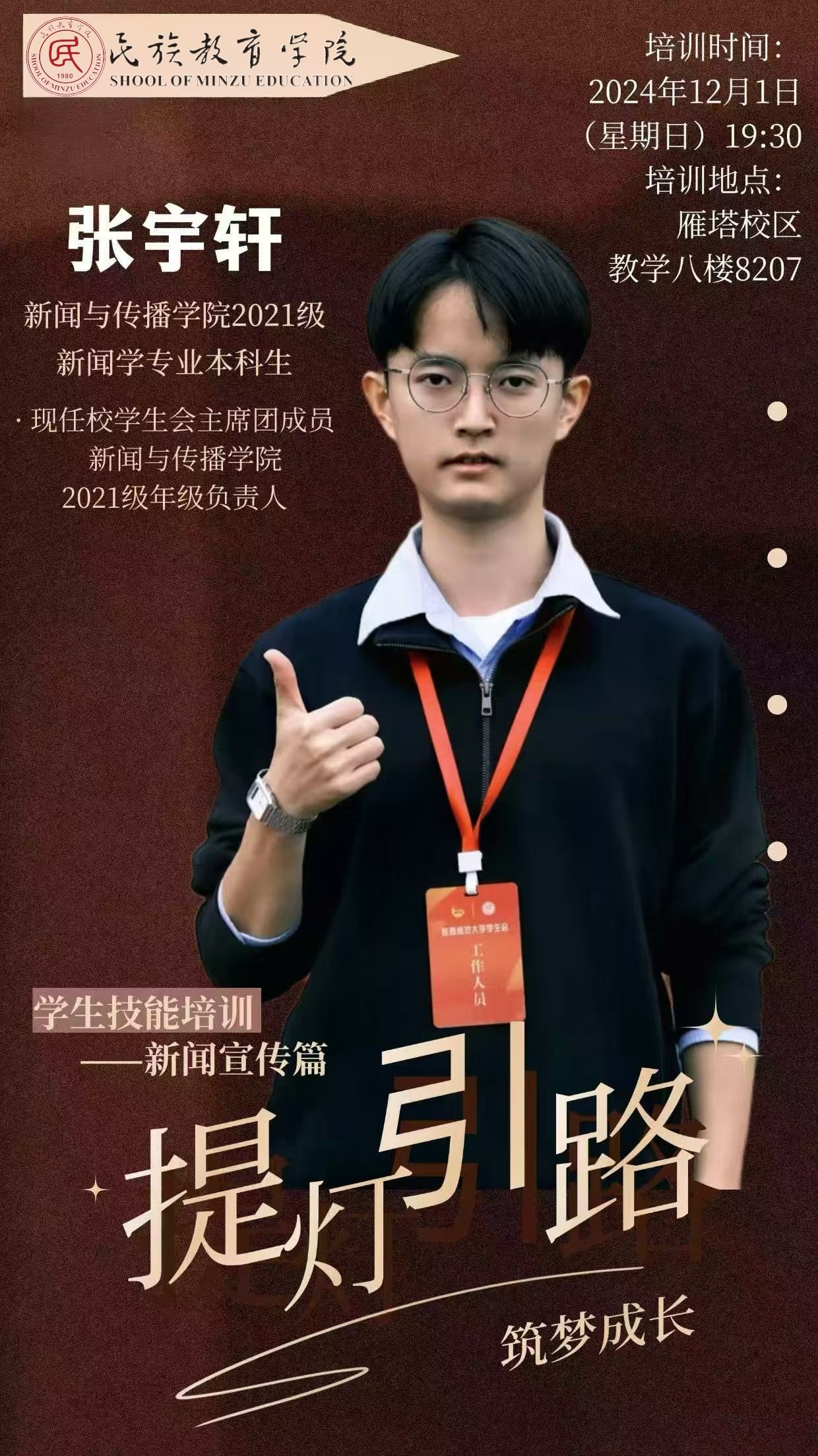 这次的系列培训活动,堪称一场知识与技能的“盛宴”,精彩纷呈、干货满满,令我受益无穷。一场场高质量的分享,犹如一场场及时雨,精准地浇灌在我学生干部工作的“成长田”里,让我的工作能力节节攀升,面对接下来繁琐复杂的任务时,多了几分从容、添了些许笃定。