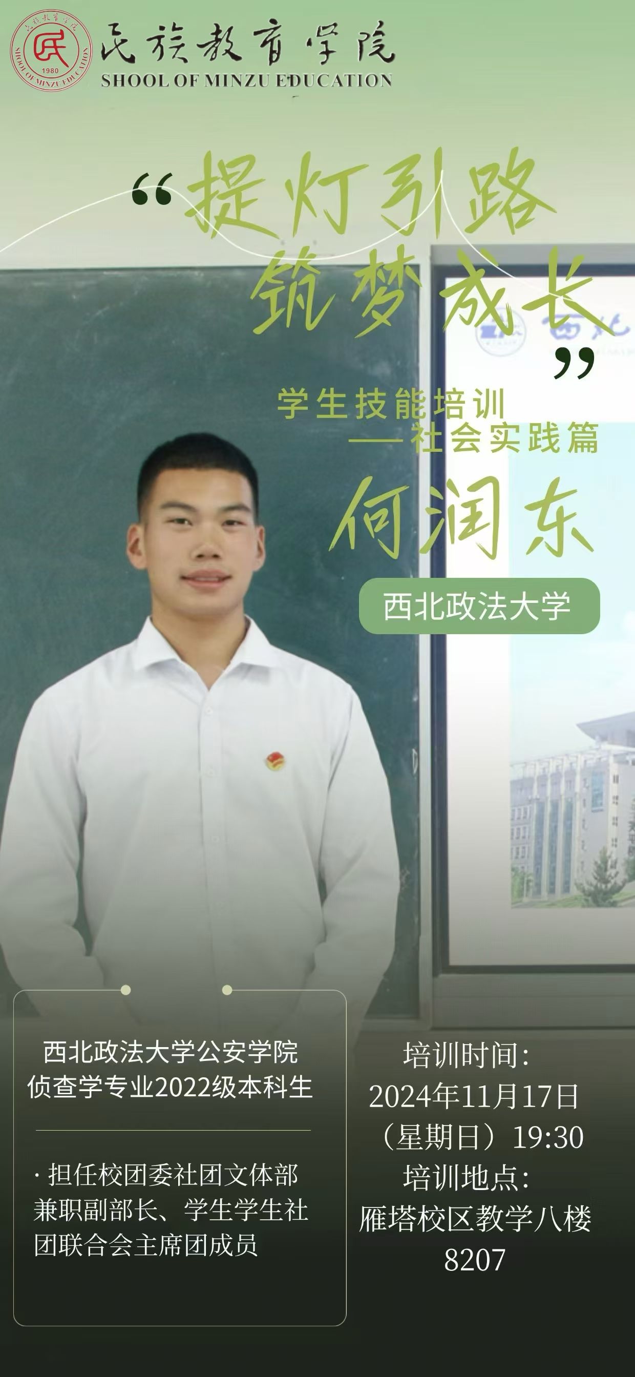 实践舞台上,西北政法大学侦查学专业2022级本科生、学生社团联合会主席团成员何润东秉持“不驰于空想,不骛于虚声”理念,借自身实习实践经历,鼓励参与培训的学员们勇于尝试,提高自身对校内外机遇的感知力,紧跟时代潮流。