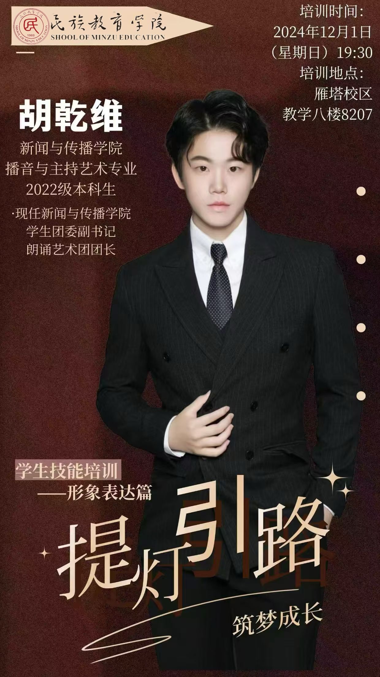 新闻与传播学院播音与主持艺术专业2022级本科生、朗诵艺术团团长胡乾维分别从“形象管理”和“语言表达”两个方面进行自己的分享,启迪参与培训的学员挖掘内在魅力、提升沟通能效,引发了学员们对个人魅力塑造与有效人际沟通的深度思考。
