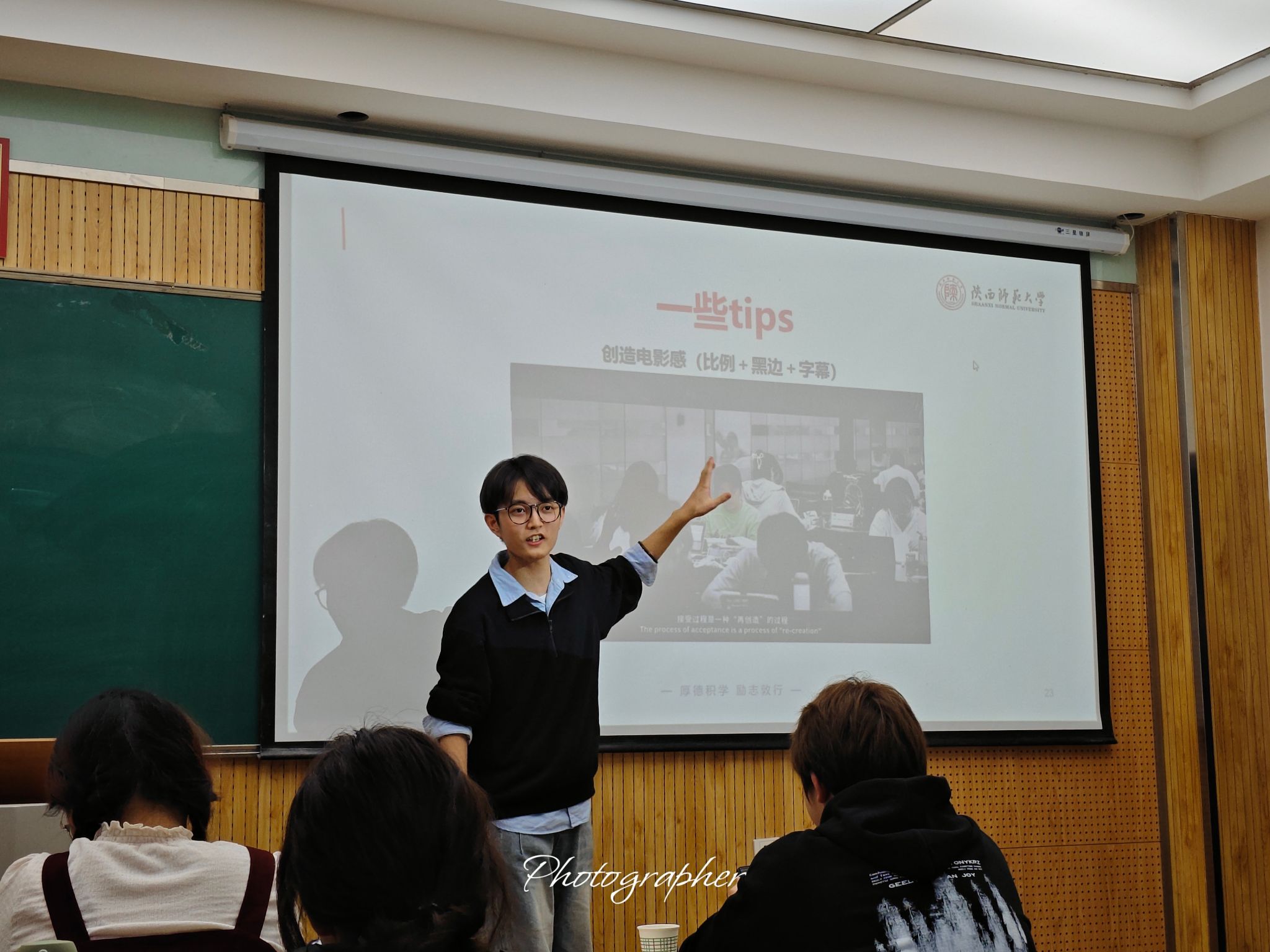 新闻与传播学院2021级新闻学专业本科生、校学生会主席团成员张宇轩直击摄影实操和新闻撰写要点,引导参与培训的学员们巧用“5个W和1个H”解锁新闻稿行文密码,并向大家详细介绍了相机的使用方法、活动摄影流程和一些摄影注意事项,助力学生干部练就一手“妙笔摄技”,精准传递校园故事。
