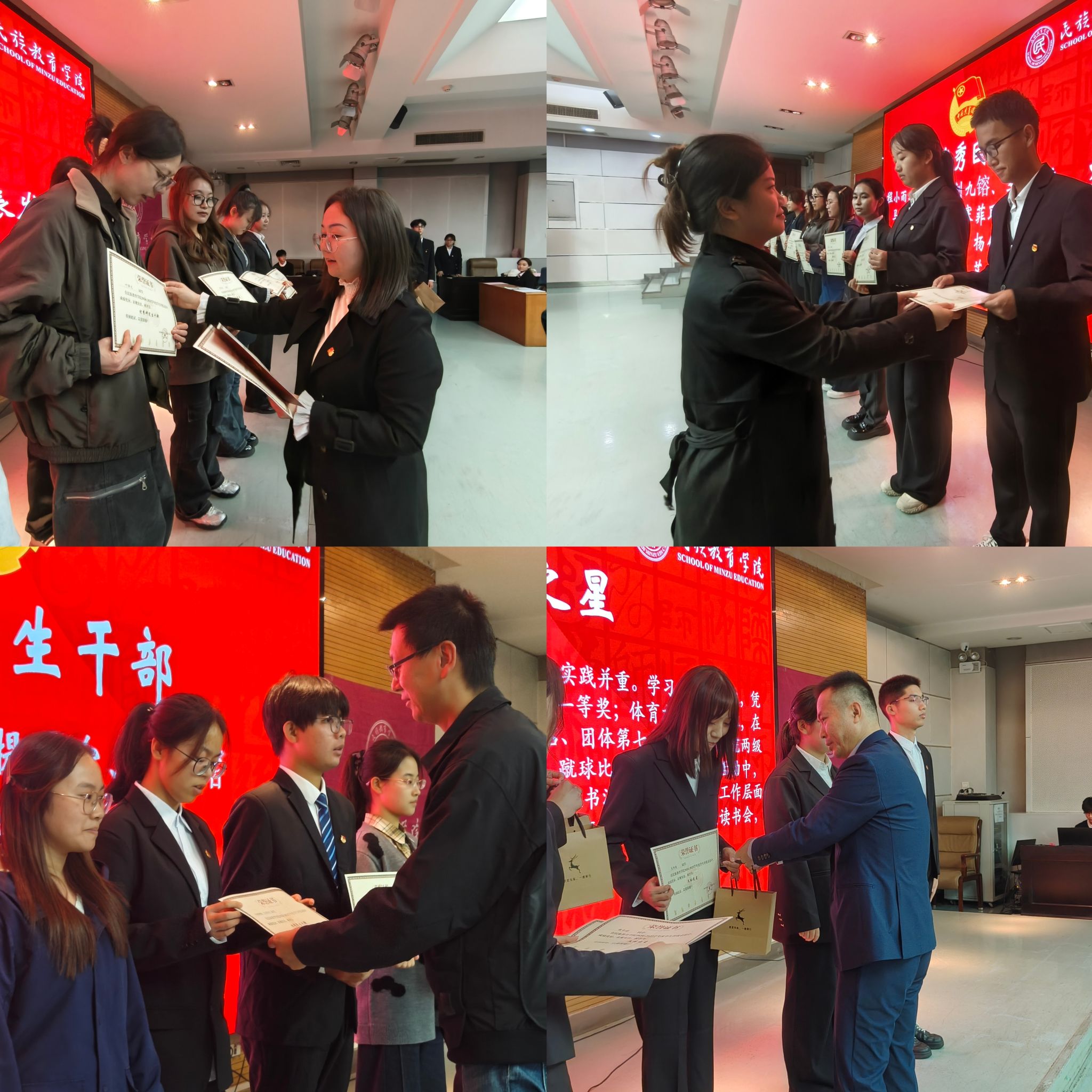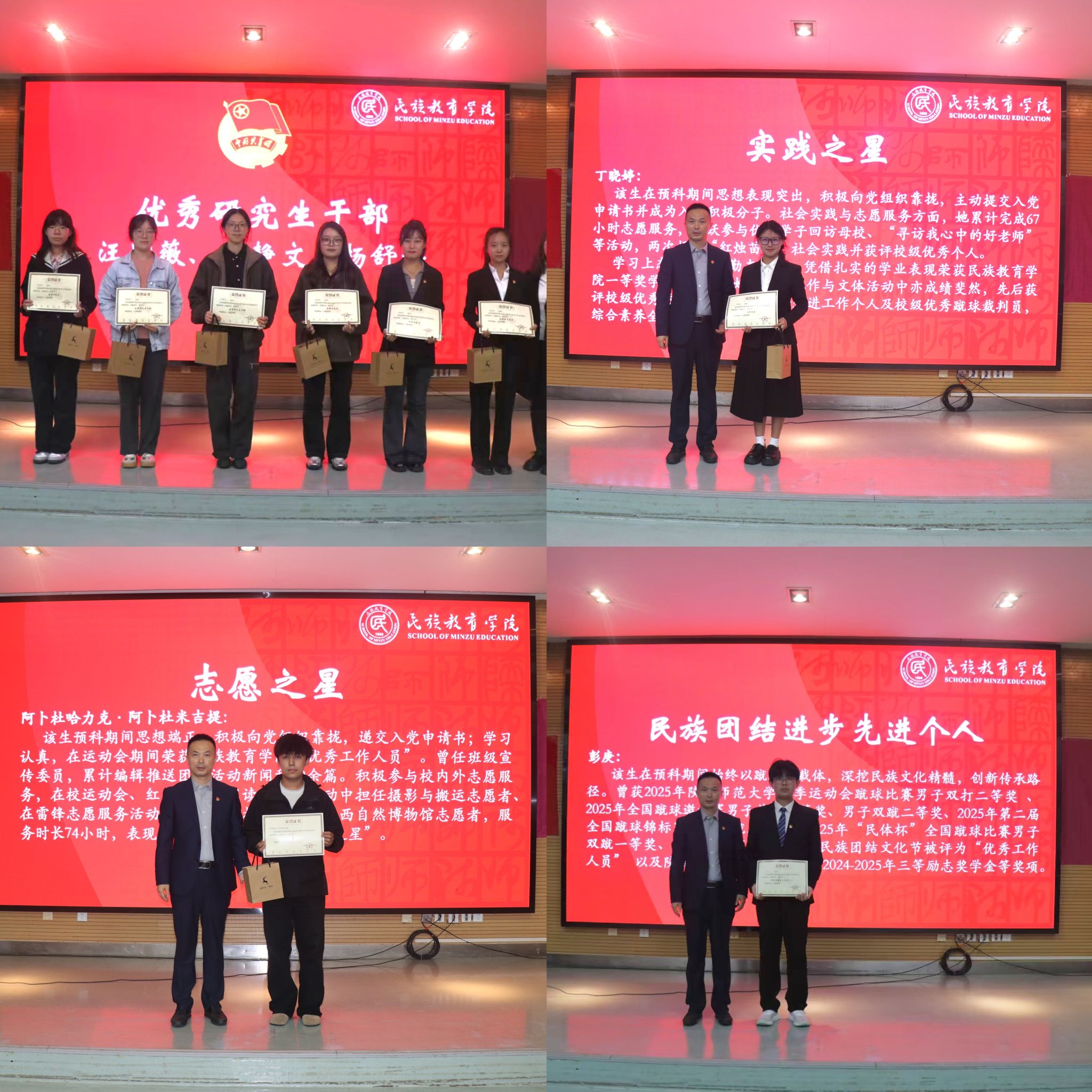 颁奖环节庄重有序,台下掌声回荡,传递正能量。此次颁奖的奖项包含了优秀共产党员、优秀毕业生、优秀研究生、优秀研究生干部及优秀团员、优秀学生、优秀学生干部、文体之星、志愿之星、实践之星以及民族团结进步个人等。