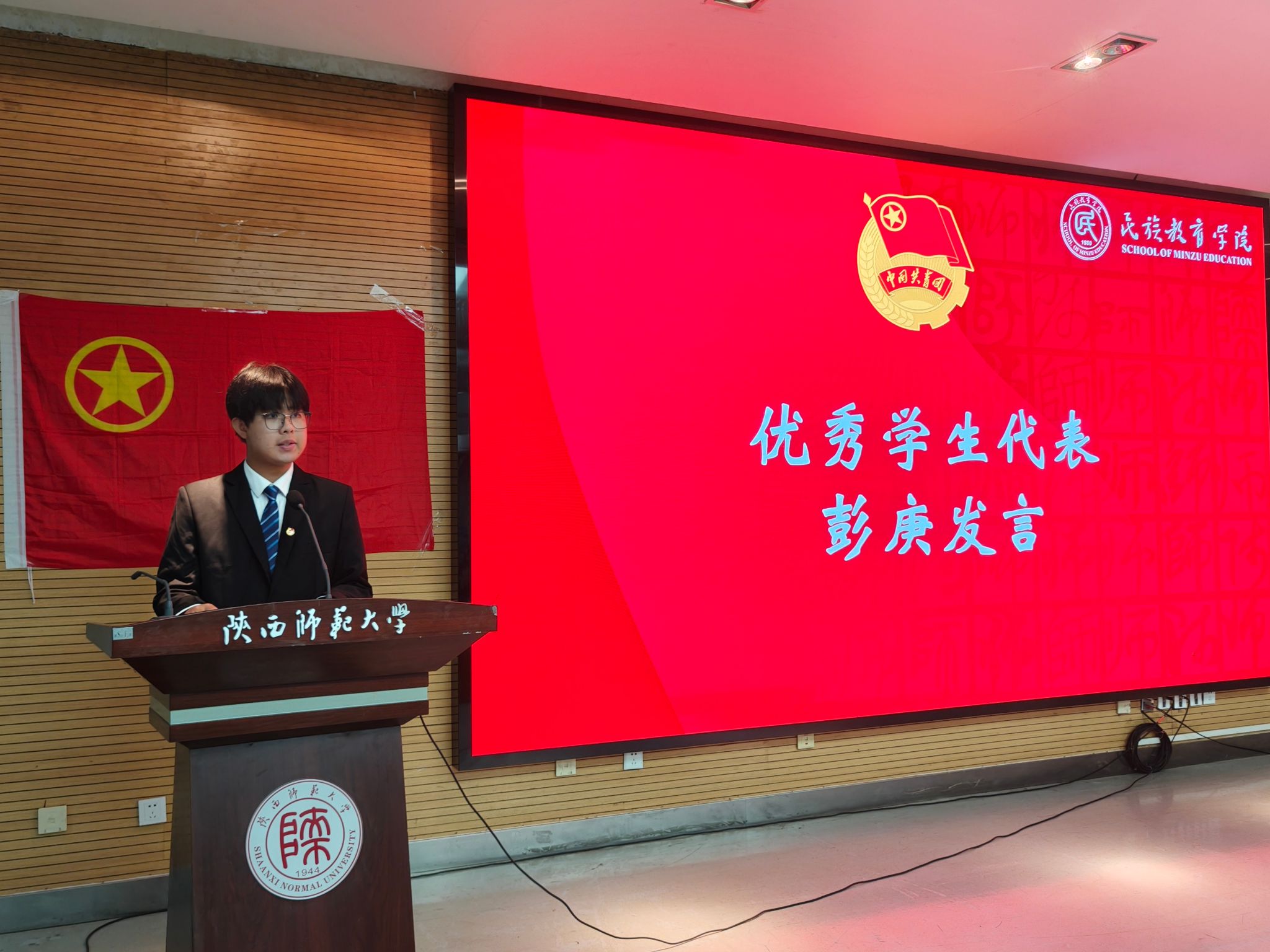 预科生获奖代表彭庚发言,他也分享了自己的成长过程:在课程学习中铸牢“五个认同”思想根基,在推广民族传统体育中践行民族团结,在参与社会实践中发扬“西部红烛精神”。最后,他鼓励学弟学妹珍惜时光,专注学业精进,在求知路上锤炼本领,为未来担当民族团结重任筑牢坚实学识基础。